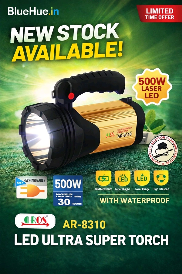 AROS AR-8310 500W Laser LED Rechargeable Torch Light | Waterproof | Long Range | 30H Backup