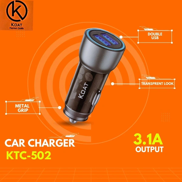 Koat Ktc-502 3.1A Duble, Usb Transparent Look, Metal Grip Car Charger