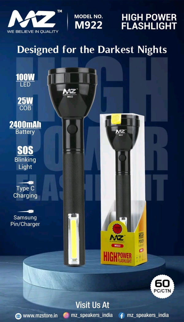MZ M-922 High Power Flash Light (200W Led , 25W COB , 2400mAh Battery, Sos Blinking Light)