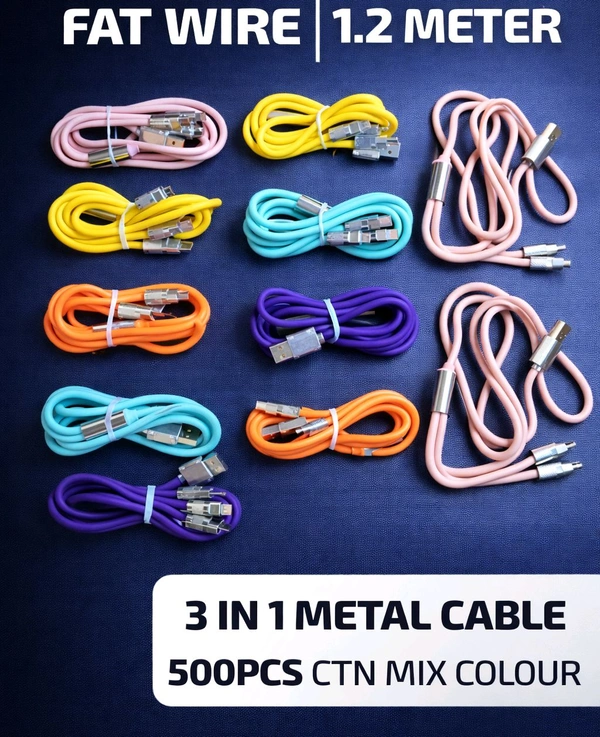 New 1.2Mtr Silicone Wire Zinc Alloy Port 3in1 Heavy Quality Cable (Micro V-8, Type C & iPhone) Loose ( Without Pecking )