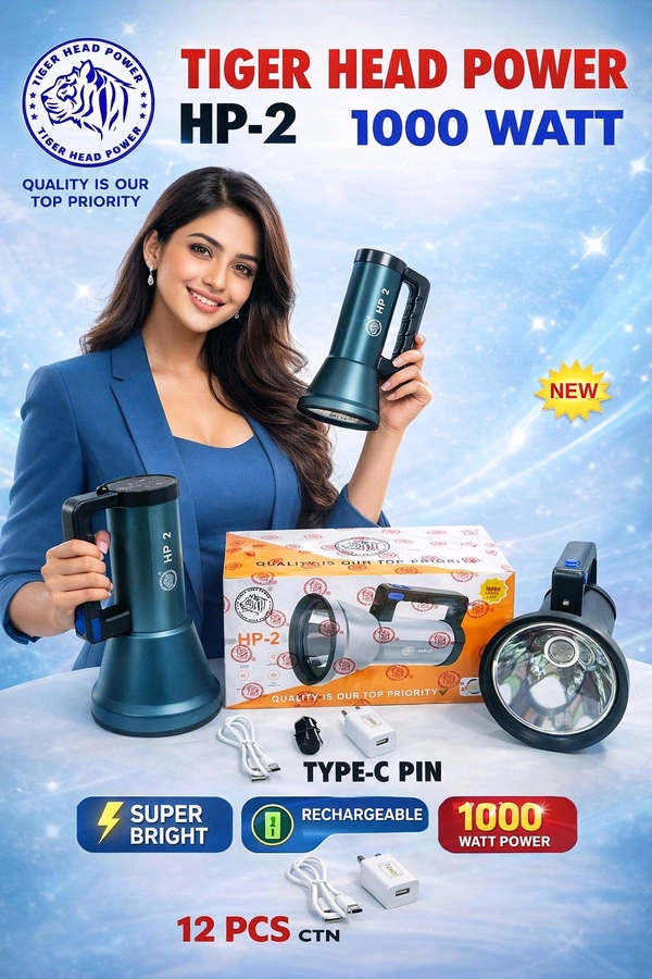 Tiger Head Power HP-2 Rechargeable Torch Light | 1000 Watt Super Bright | Type-C Charging | Heavy Duty Search Light