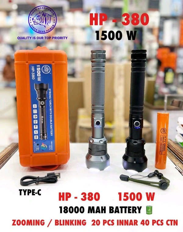 Tiger Head Power HP-380 Zooming ! Blinking ! 1500Wts ! 18000Mah Battery ! Type C Port Torch