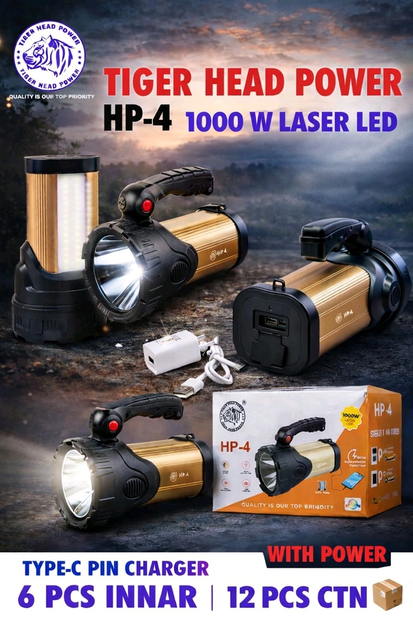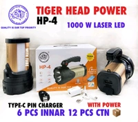 Tiger Head Power HP-4 1000W Laser LED Torch Light with Side Tube Light | Type-C Rechargeable | Power Bank Function