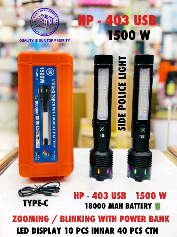 Tiger Head Power HP-403 Zooming ! Blinking ! 1500Wts ! 18000Mah Battery ! Side Tube ! Led Display Metal Torch