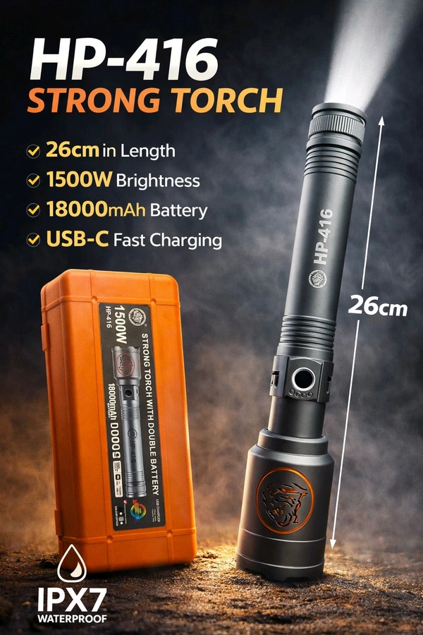 Tiger Head Power Hp-416 Led Rechargeable (1500Wts 18000Mah Battery π, Waterproof) Torch