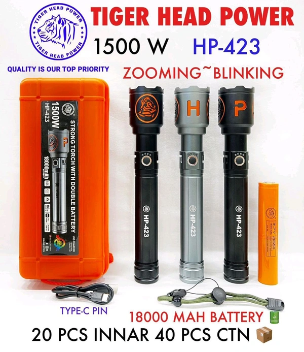 Tiger Head Power HP-423 Zooming ! Blinking ! 1500Wts ! 18000Mah Battery ! Type C Port Torch