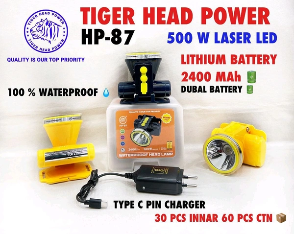Tiger Head Power HP-87 Waterproof Headlamp (500W Laser Led , Zooming , Blinking , Type C Charging Port)
